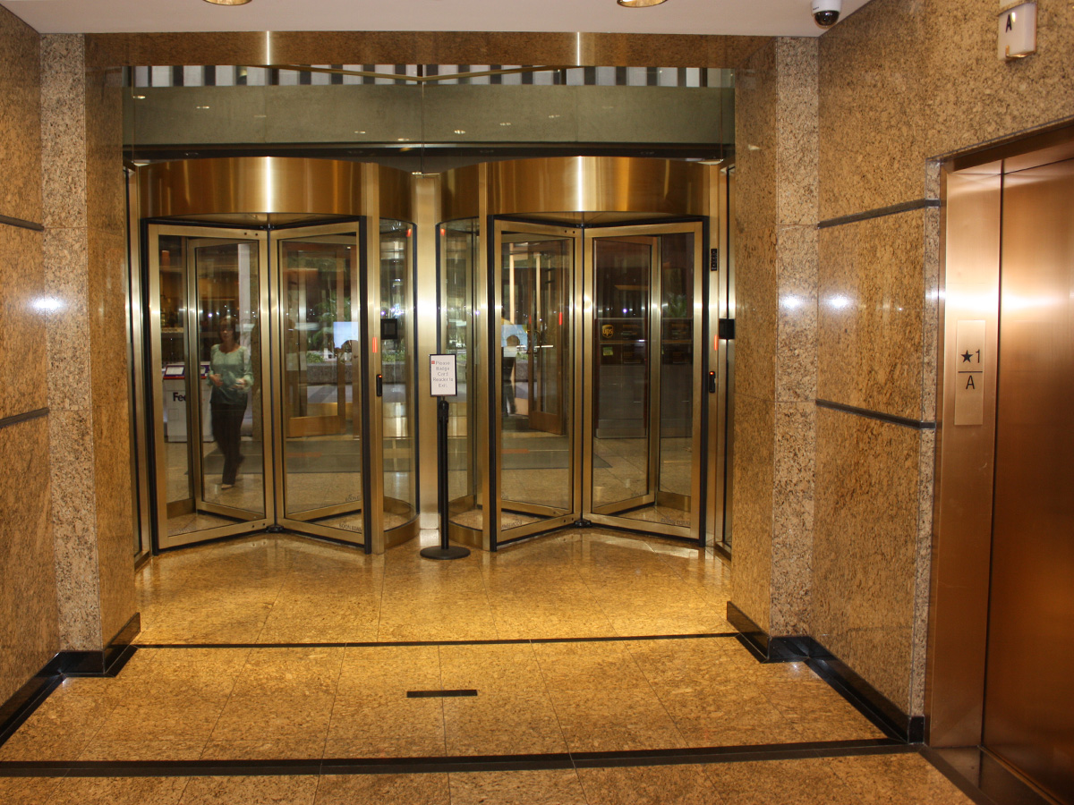 The bank’s offices take up over 20 floors of a heavily-trafficked, high-rise building in a downtown area. A security desk is positioned in the main lobby of the building; however, there is no security coverage to the two banks of elevators. To best track permitted access, the bank wanted to enclose the elevator towers with automatic revolving doors outfitted for electronic access control.