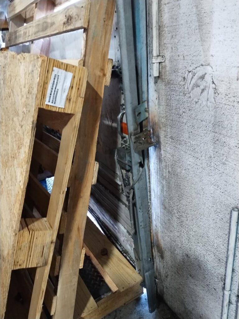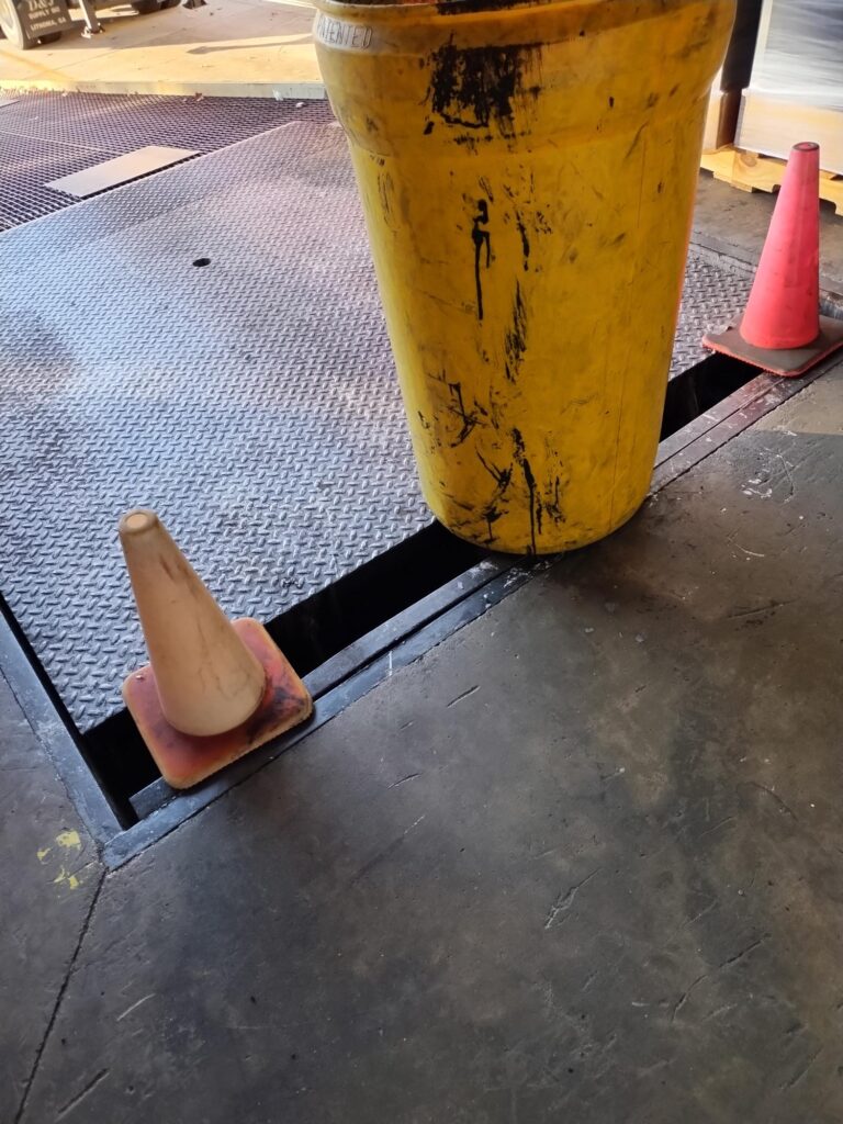 Problem: The dock leveler’s rear structure has failed and broken loose from its attachment point creating a serious OSHA fall and trip hazard.