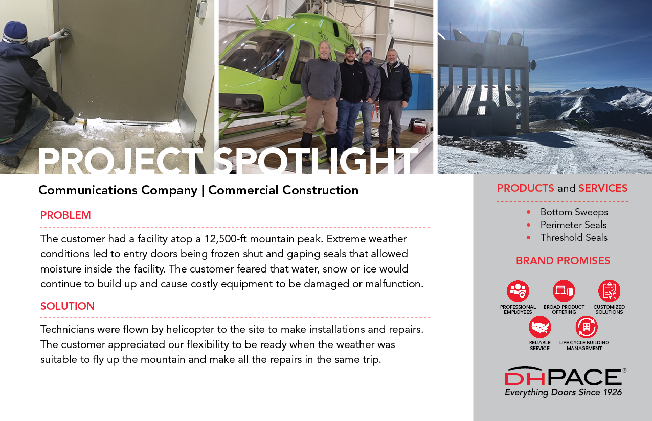 The customer had a facility atop a 12,500-ft mountain peak. Extreme weather conditions led to entry doors being frozen shut and gaping seals that allowed moisture inside the facility. The customer feared that water, snow or ice would continue to build up and cause costly equipment to be damaged or malfunction.