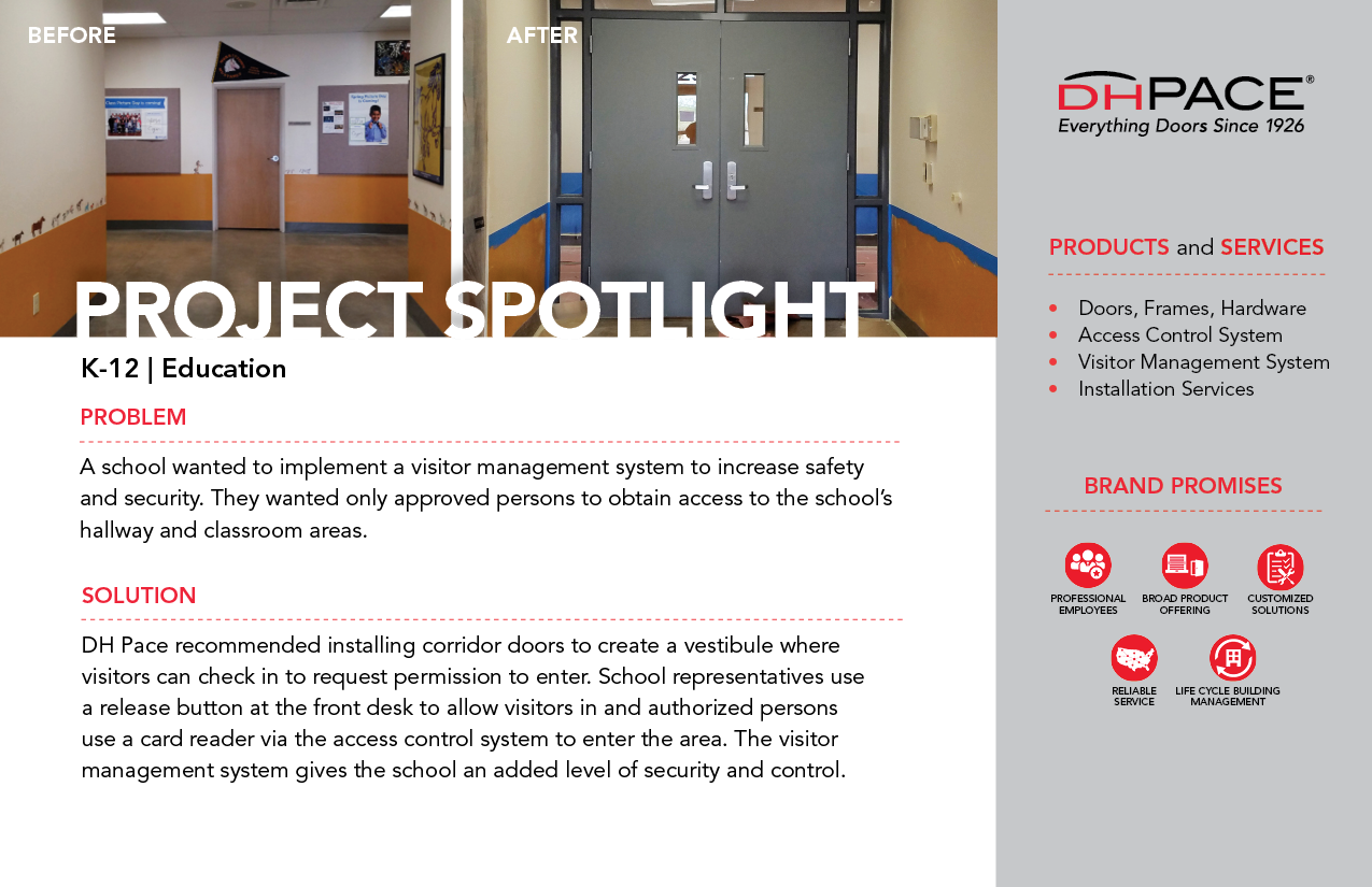 DH Pace recommended installing corridor doors to create a vestibule where visitors can check in to request permission to enter. School representatives use a release button at the front desk to allow visitors in and authorized persons use a card reader via the access control system to enter the area. The visitor management system gives the school an added level of security and control.