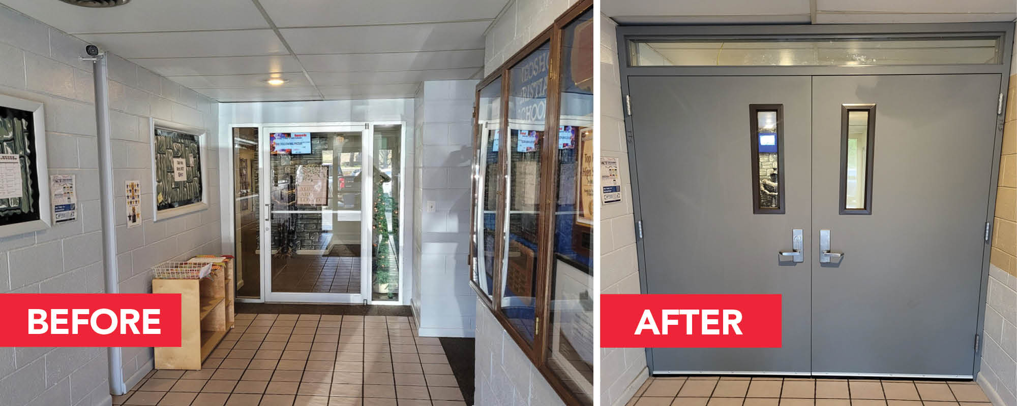 DH Pace provided a solution to the school that would fit within the existing space and not require heavy construction. A set of hollow metal doors with a transom lite was installed in the main hallway, just before the entrance to the classroom area. This door can be kept locked during the school day to keep intruders from walking into the classrooms. The result is an added layer of security for the school and a greater sense of safety for faculty, staff, and students.