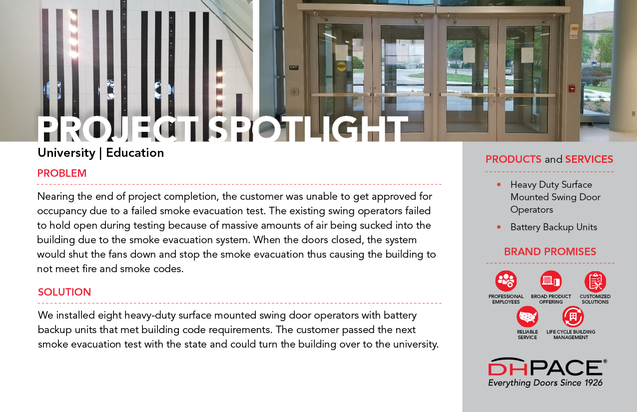 We installed eight heavy-duty surface mounted swing door operators with battery backup units that met building code requirements. The customer passed the next smoke evacuation test with the state and could turn the building over to the university.