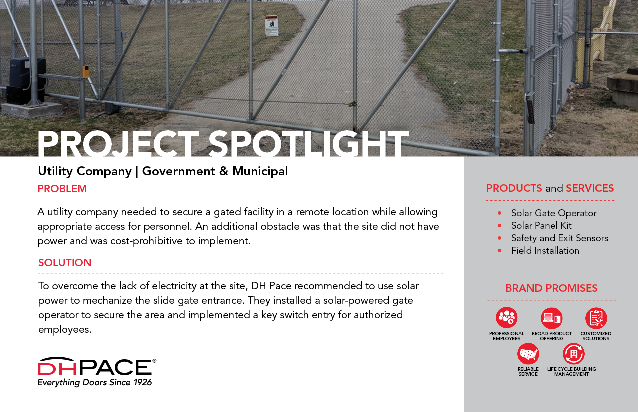 A utility company needed to secure a gated facility in a remote location while allowing appropriate access for personnel. An additional obstacle was that the site did not have power and was cost-prohibitive to implement.